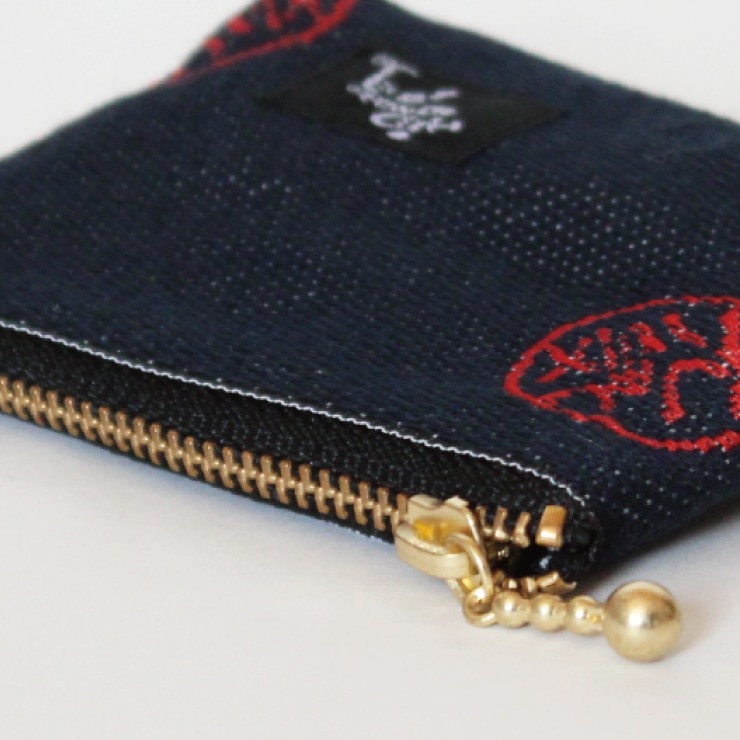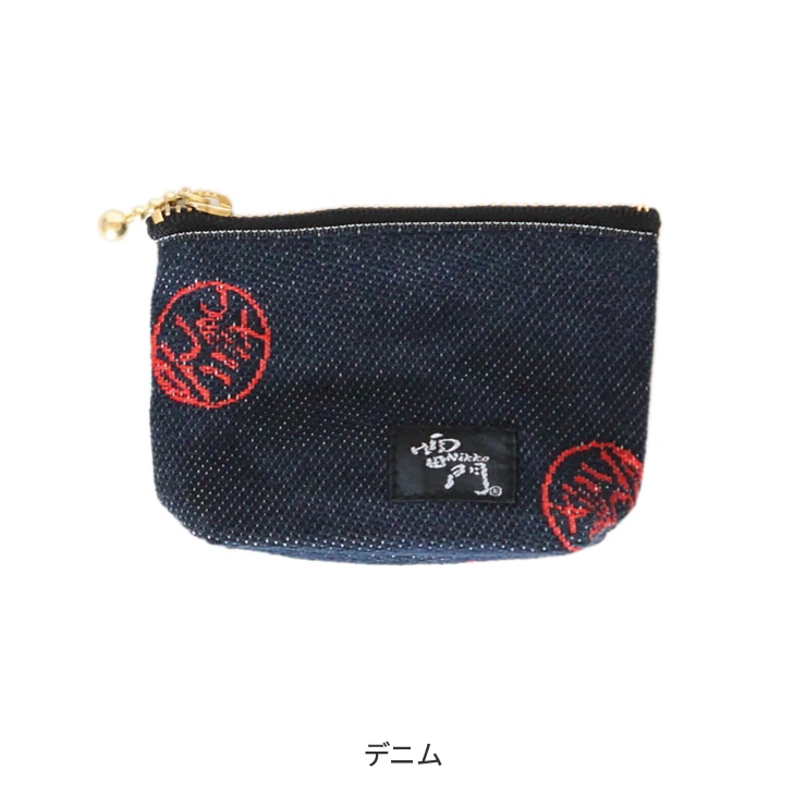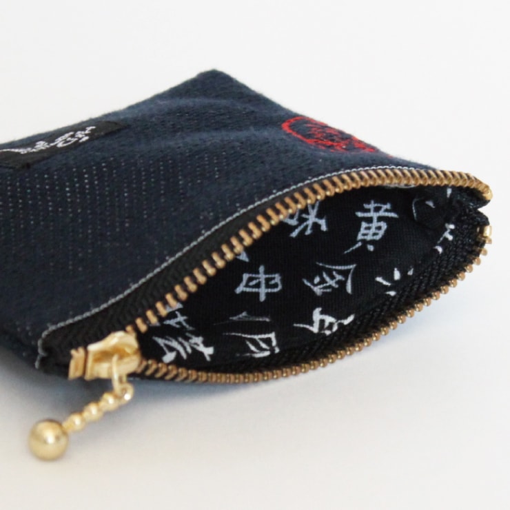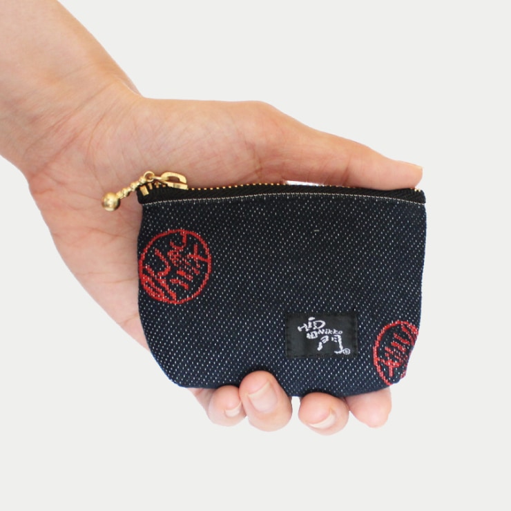 丈夫な畳縁&デニムのコンパクト小銭入れ。ポケットに入れても煩わしさのない、片手にすっぽりと収まるサイズ感。裏地には漢字がデザインされた生地を採用。ここでしか買えない日興オリジナル。