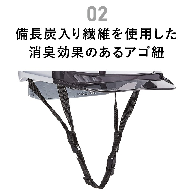 前面と天面の大きな通気孔により、通気性能が格段にアップし、帽体内の蒸れを解消。”Air Flow”設計により、帽体内の蒸れた空気が、ヘルメット後部の通気孔に抜けて行く構造となっています。あごヒモには備長炭入り繊維を採用し、消臭効果を発揮。さらに、ステッチ部分は帯電防止処理を施すことでホコリが付きにくくなります。ひさしは、傷が付きにくい特殊ハードコーティング加工。紫外線99.9%カットします。飛来・落下物用+墜落時保護用の2種兼用タイプで、厚生労働省保護帽検定合格品です。