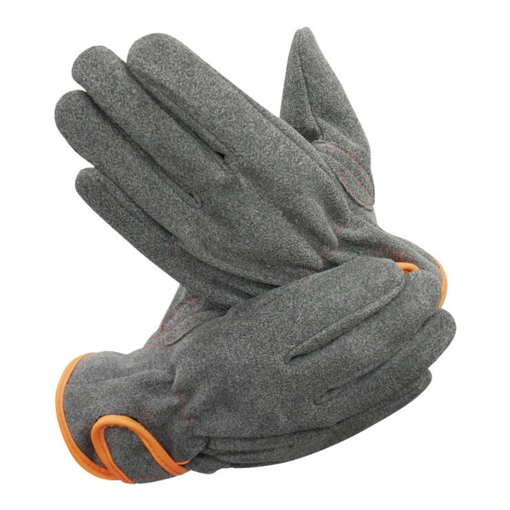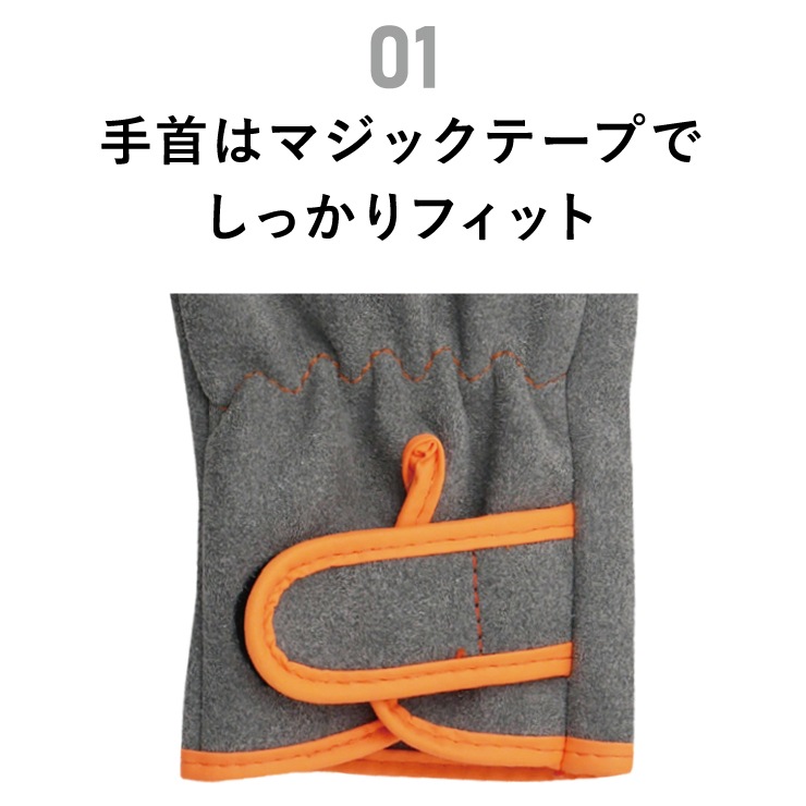 ハードワークに最適な天然皮革に迫る、人工皮革の”カワテック”。天然皮革に比べて安定した品質で、装着時に粉が付かない爽やかな付け心地。水洗い可能で清潔な状態を保持。手首部分はマジックテープで調節可能。グレー地にオレンジのバイアステープがアクセント。摩耗に強い耐久性と手になじむ柔らかさが特徴で、ハードワークに強く幅広い用途に対応。※溶接、鋳造など火花や火を伴う作業には使用しないでください。