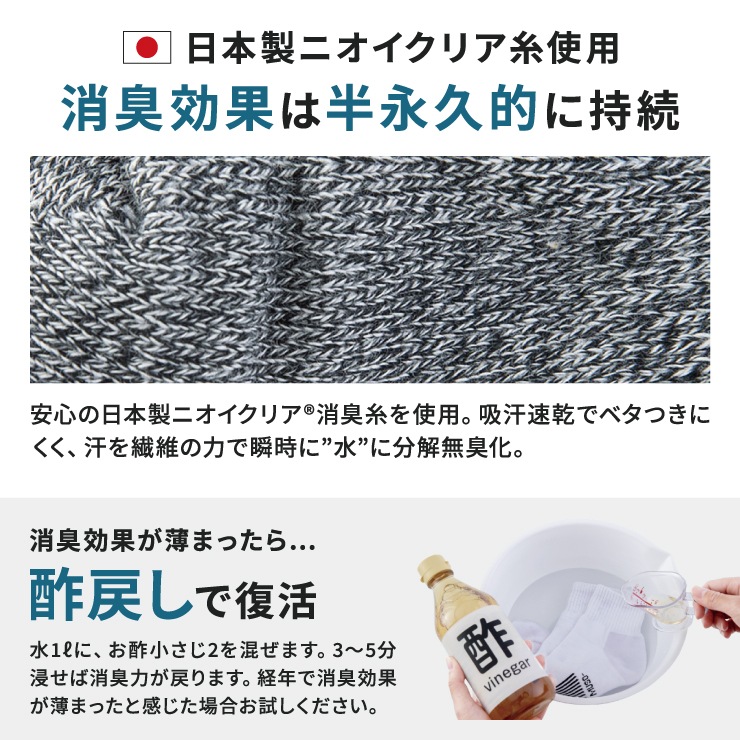 足臭・汗臭の3大要因を徹底的に分解消臭。日本製消臭糸”ニオイ...