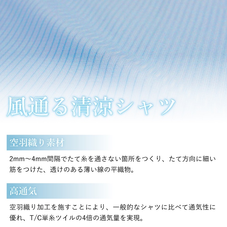 2mm~4mm間隔でたて糸を通さない箇所を作り、たて方向に細い筋をつけた透け感のある空羽織り素材。汗をかいてもサラリとした着心地をキープ。動きやすい適度なストレッチ性と、清涼感で夏場の作業にぴったり。※2枚以上購入で1枚あたり490円引き。