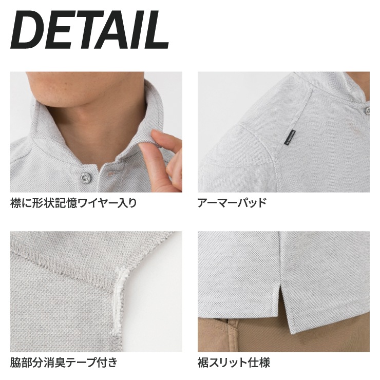 ハリコシのあるヘビーウェイト鹿の子素材を採用。短めの袖丈・着丈とサイドスラッシュ加工でシャープなシルエットを実現。ワイヤー入りの衿先で絶妙な"立ち"がアクセント。両脇に不快なニオイを軽減する消臭テープを配置。
