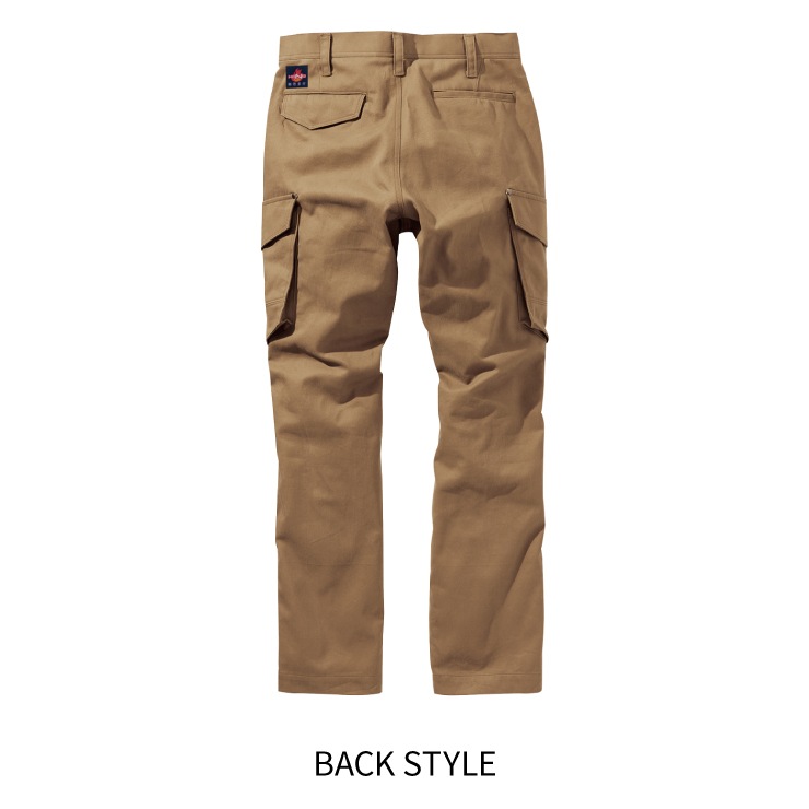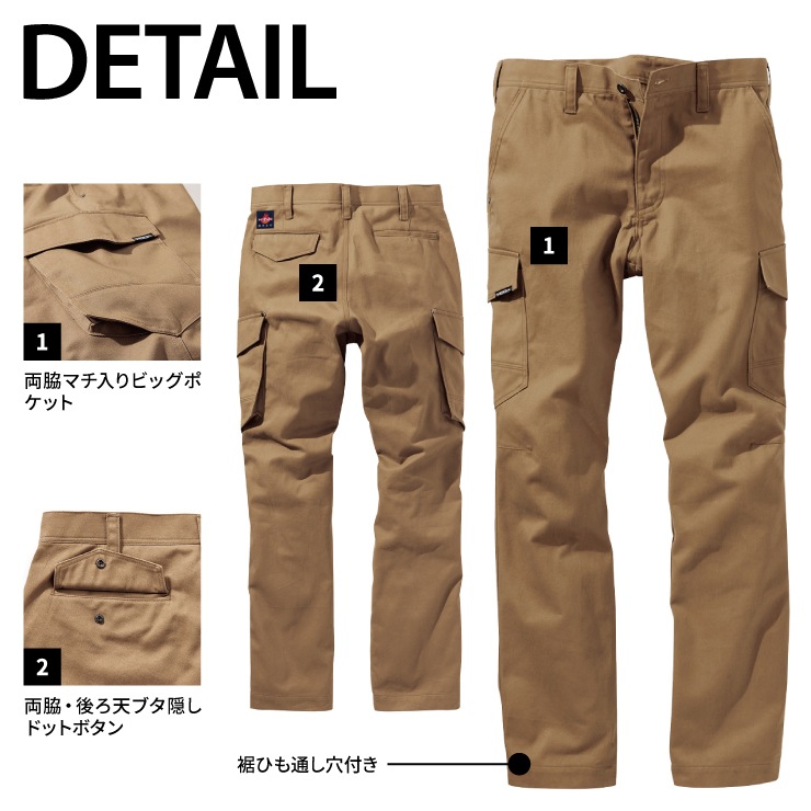 両サイドポケット / 両脇マチ入りポケット / 左後フタ付きポケット / 右後ポケット / 裾ひも通し穴 / 両脇・後ろ天ぶた隠しドットボタン