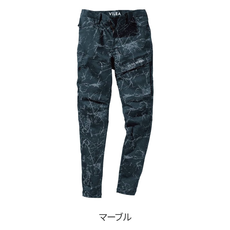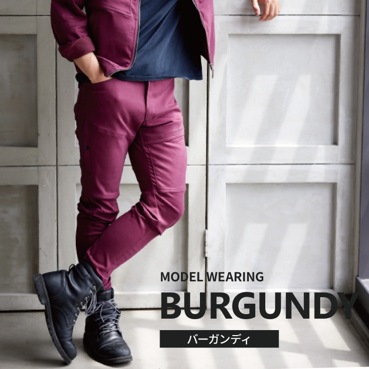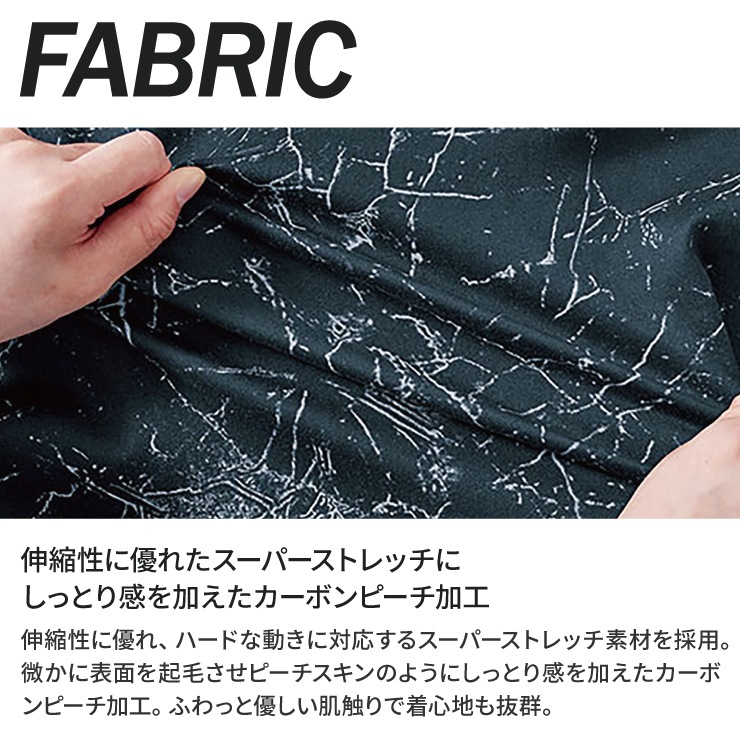 伸縮性に優れハードな動きにも対応するスーパーストレッチ素材。微かに表面を起毛させしっとり感を加えたピーチスキン加工を施し、ふわっと優しい肌触りが魅力。マチ付きポケットやファスナー付きポケット等、機能的にも優れたカジュアルワークカーゴ。
