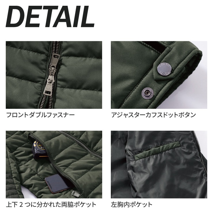 両側ポケット(上下2つに等分)/ アジャスターカフス / 左胸内ポケット / フロントダブルファスナー
