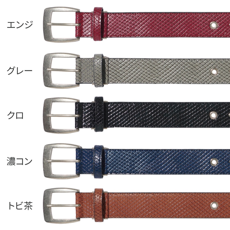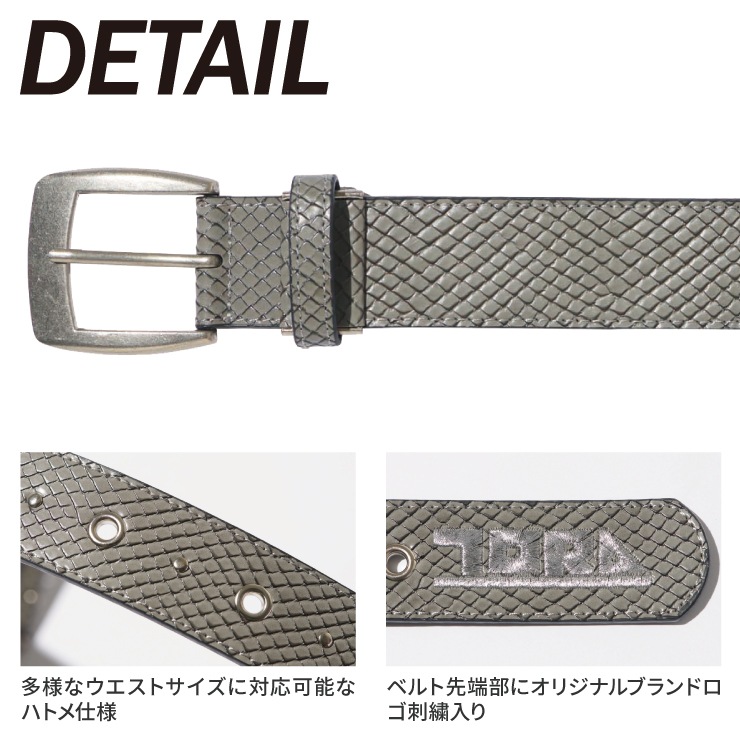 多様なウエストサイズに対応可能なハトメ仕様。ダークなカラーと凹凸のある素材感がファッショナブル。ベルト先端部にブランドロゴの刺繍入りでさりげなくデザイン性を格上げ。