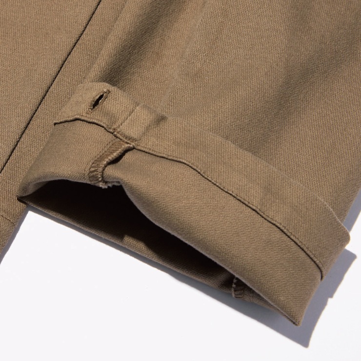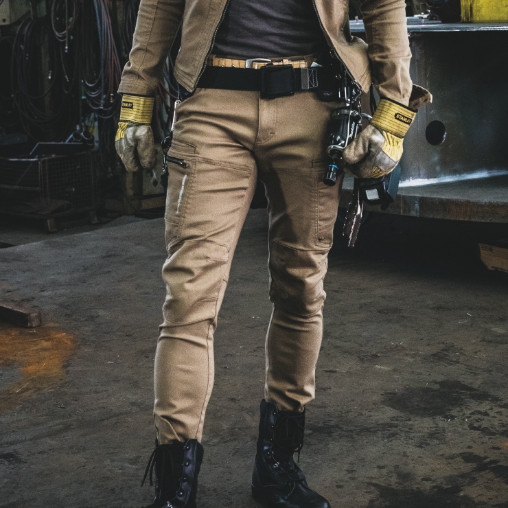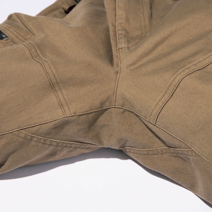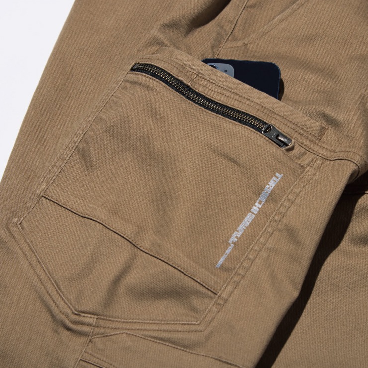 厚手の綿ストレッチ”ジャーマンクロス”素材を採用。3Dパターンによる立体仕様で自由自在な動きをサポート。縦使いのフロントファスナーポケットがデザインのポイントに。