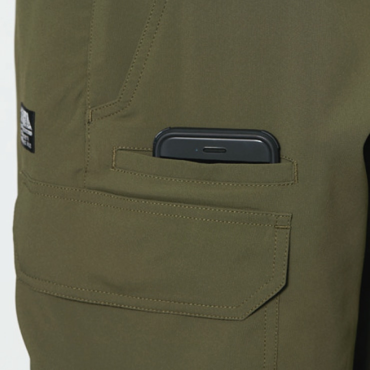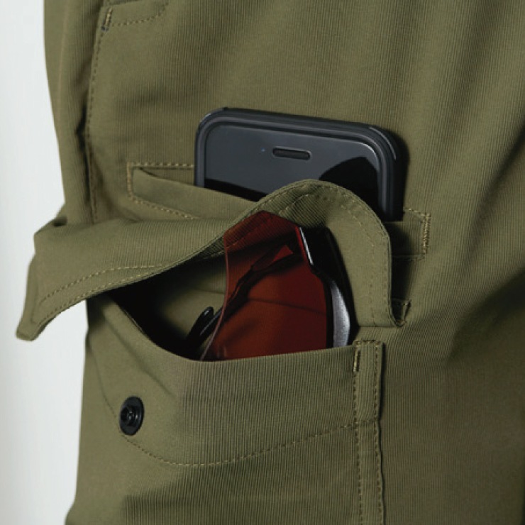 両側ポケット / 右前カラビナループ / 後身両側ポケット / 右側モバイルポケット / 右側カーゴポケット / 裾半フライス仕様