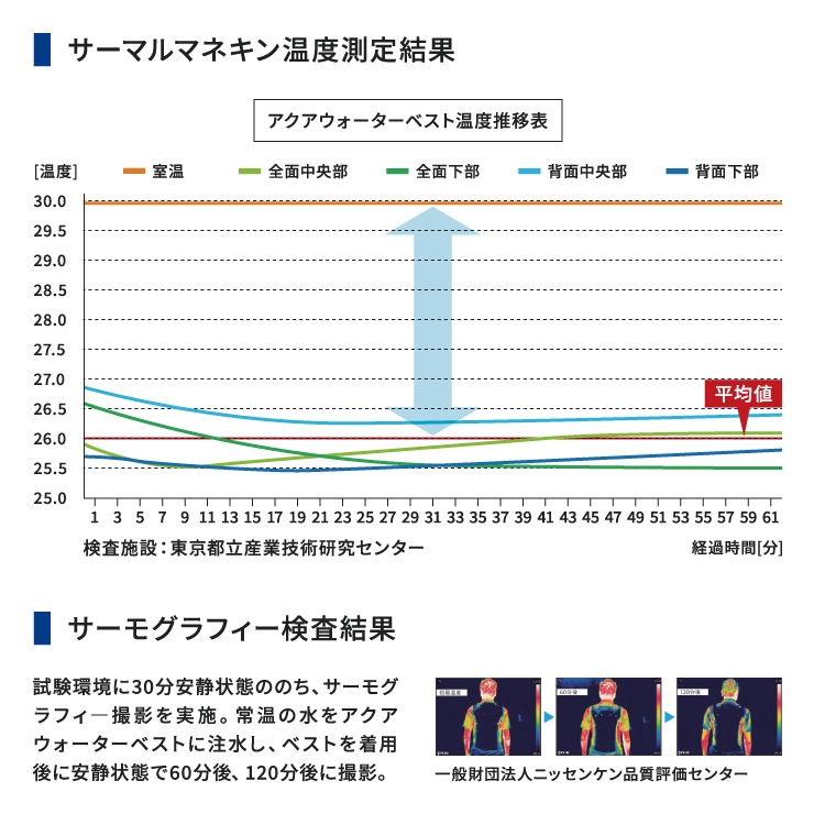 ファン付きウェアのインナーとしても最適なアクアウォーターベスト。独自に開発された気化熱冷却システムを採用。バッテリー・保冷剤不要で水の力だけで長時間冷却効果が持続。熱吸収と冷感素材で今までにない新しい暑熱対策ウェア。