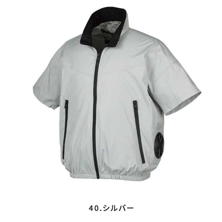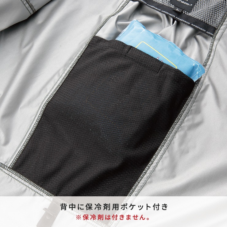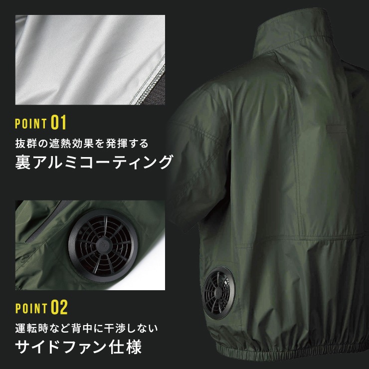 カートに入れる裏アルミコーティングにより遮熱性を高め、暑い夏でも快適に着用できる半袖空調服。背中の保冷剤ポケットにお手持ちの保冷剤を入れる事でさらに冷却効果アップ。椅子に座って作業する際もファンが背もたれに当たらないサイドファン仕様。
