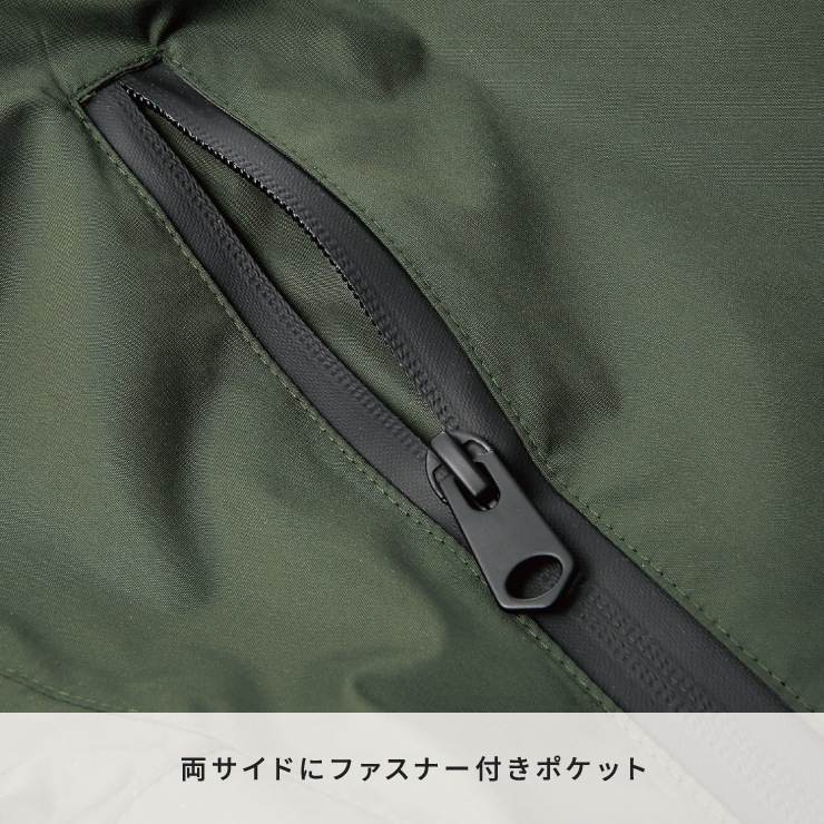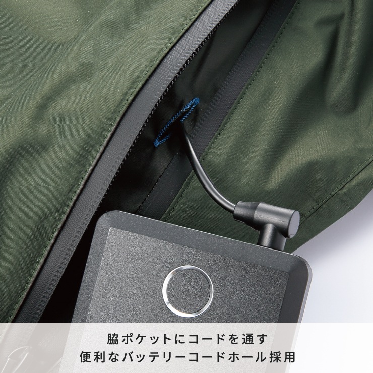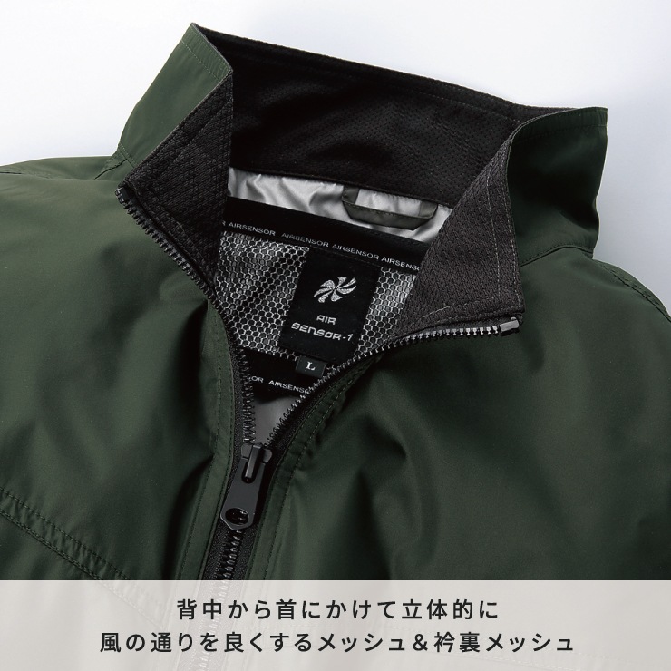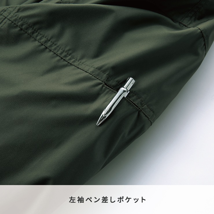 衿裏メッシュ / 左袖ペン差しポケット / 背中ポケット / 両側ファスナーポケット / バッテリーコードホール / サイドファン仕様 / 裾ゴム仕様