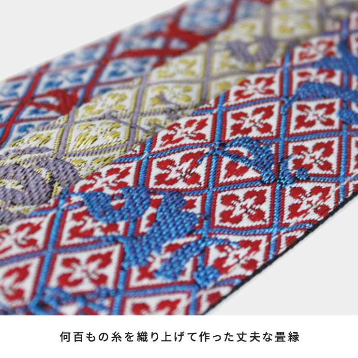 岡山県児島の畳縁メーカー協力のもと、色鮮やかでカラフルな強度の高い畳縁を採用。何百もの糸を織り上げて作った丈夫な畳縁に、ナイロン製の裏地を職人が丁寧に縫い合わせた高品質な日本製。ここでしか買えない日興オリジナル。