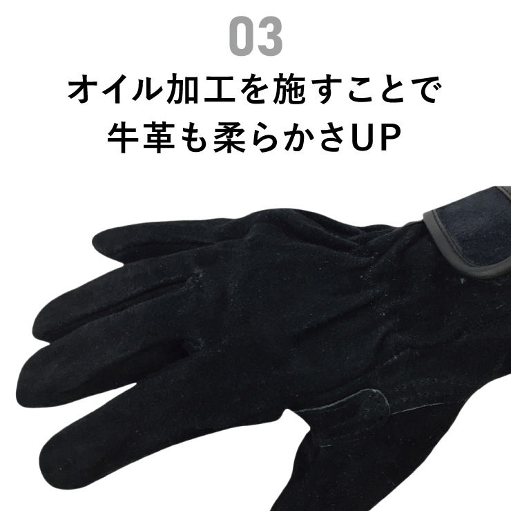 牛床革のバット部(背中)を使用し、厚みをやや薄く調整したAグレード。革にオイル加工を施すことで丈夫さと柔らかさを追求。さらに、水洗い可能で清潔な状態を保持。手首部分はマジックテープで調節可能。内綿付きで夏は爽やか、冬は暖かい。ハードワークに強く、幅広い用途に対応。作業用手袋としてはもちろん、キャンプやレジャーなど様々な場面で大活躍。牛床革のバット部(背中)とショルダー部を使用したAグレード床革手袋。