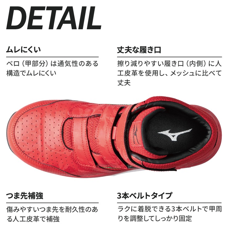 競技向けに開発された素材とセル構造から生まれる優れたクッション性が快適な履き心地を実現。シューズサイドに通気性抜群のメッシュ素材を採用。ラクに着脱できる3本ベルト仕様で、甲周りを調節してしっかり固定。