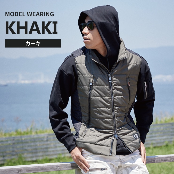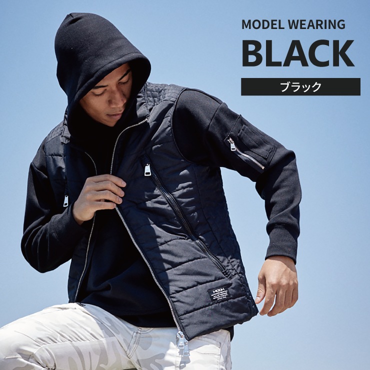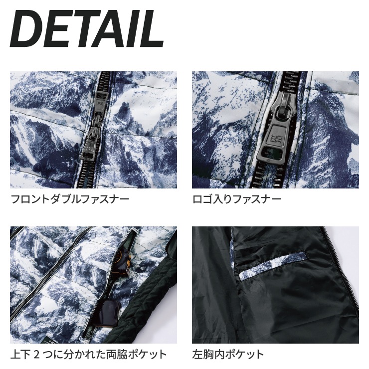両側ポケット(上下2つに等分)/ 左胸内ポケット / フロントダブルファスナー