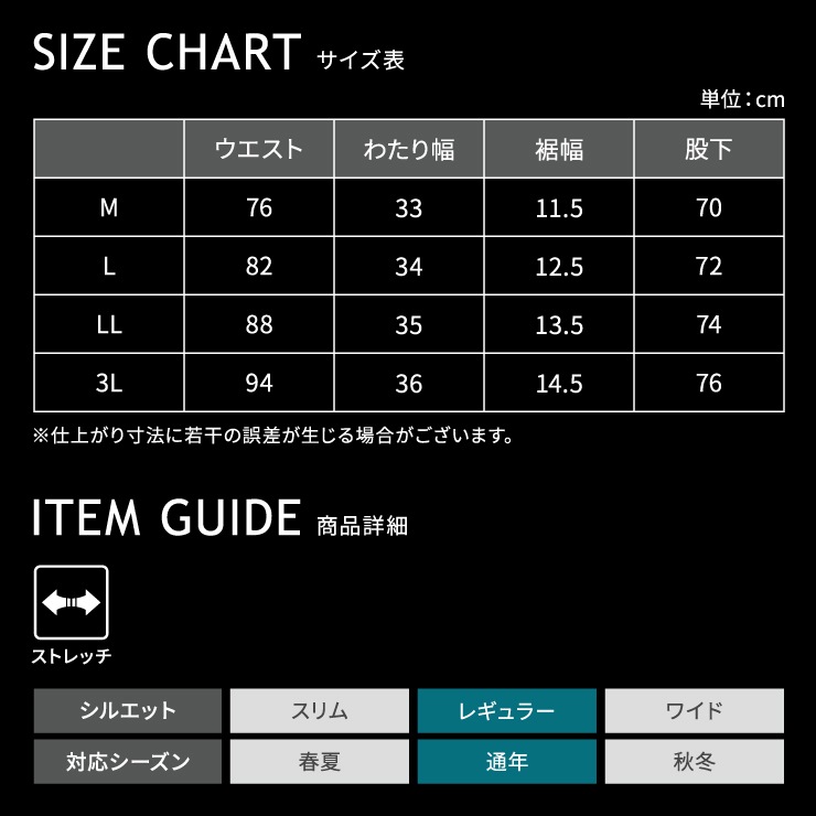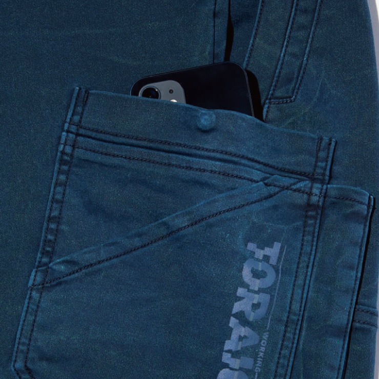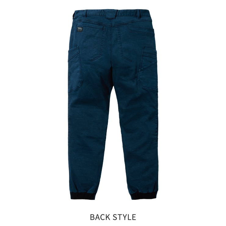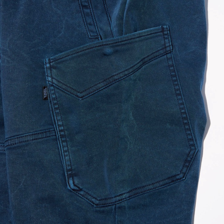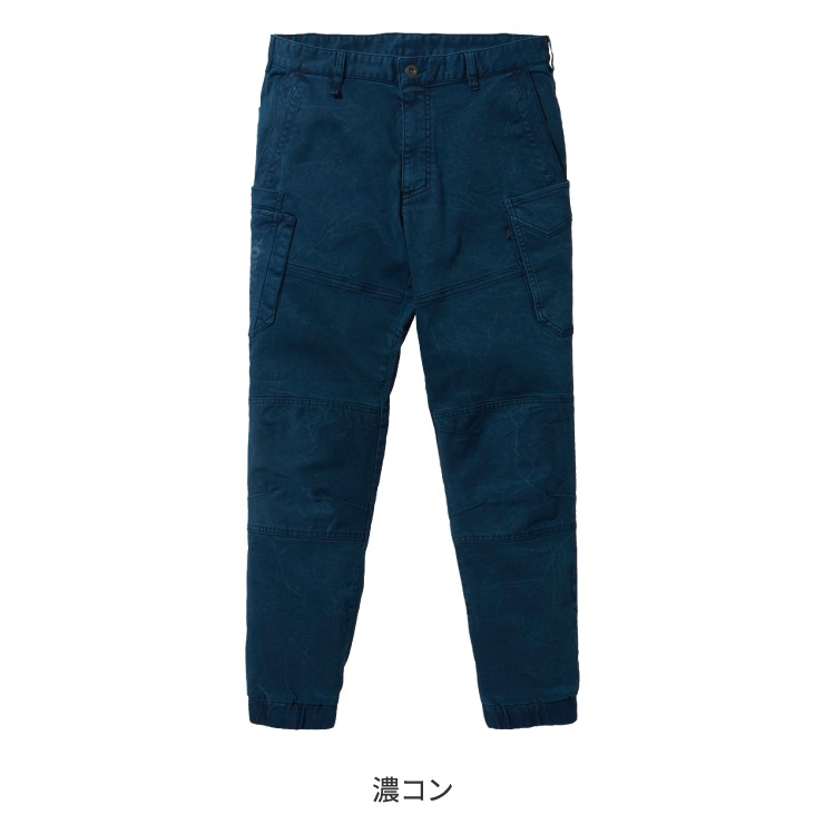 快適に動ける横ストレッチにテーパードシルエットでスタイリッシュなシルエットを実現。バイオ加工のムラ染めで独特な風合いを演出。