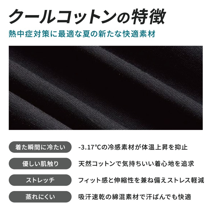 カートに入れる-3.17℃の接触冷感が体温の上昇を抑止。吸汗速乾に優れた綿混素材とフラットシーム加工で快適な着心地を実現。敏感肌の方にも安心な天然コットンを使用。フィット感と伸縮性を兼ね備えストレス軽減。不快なニオイを軽減する消臭テープを配置。