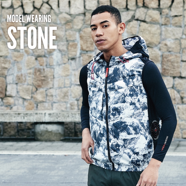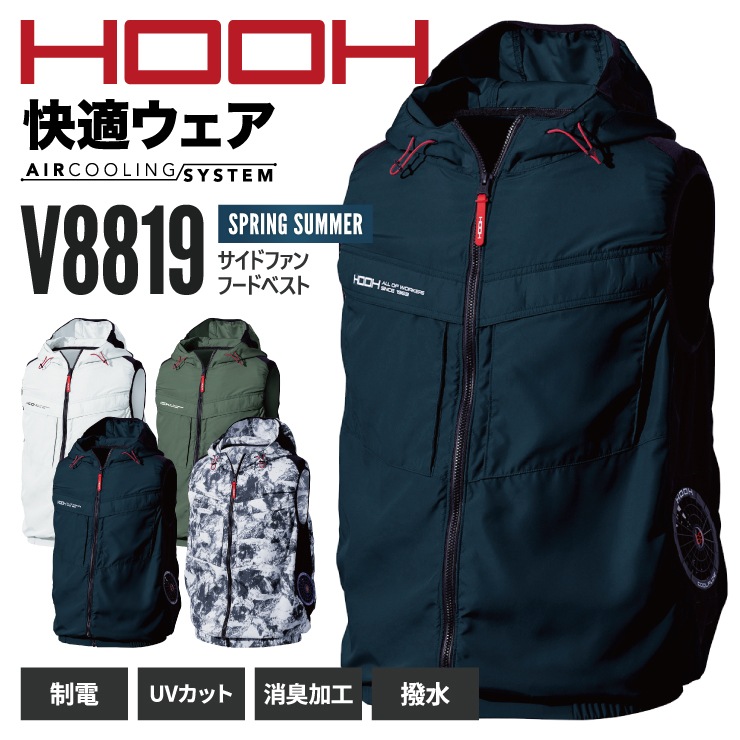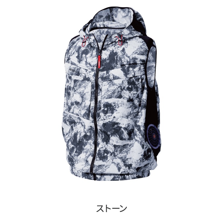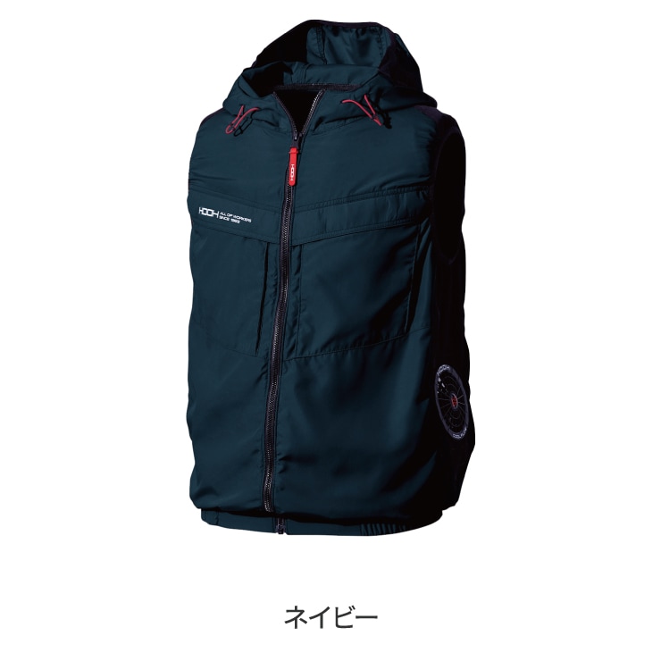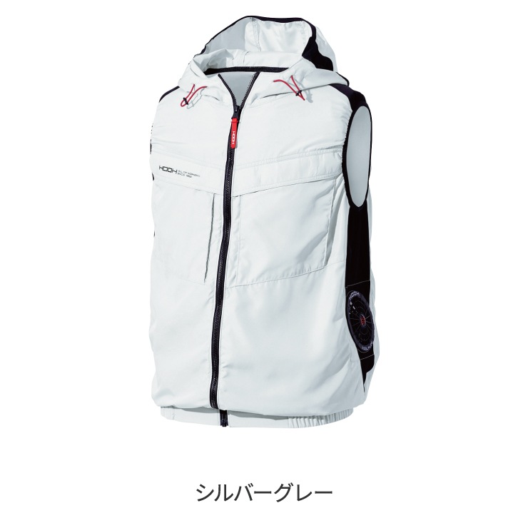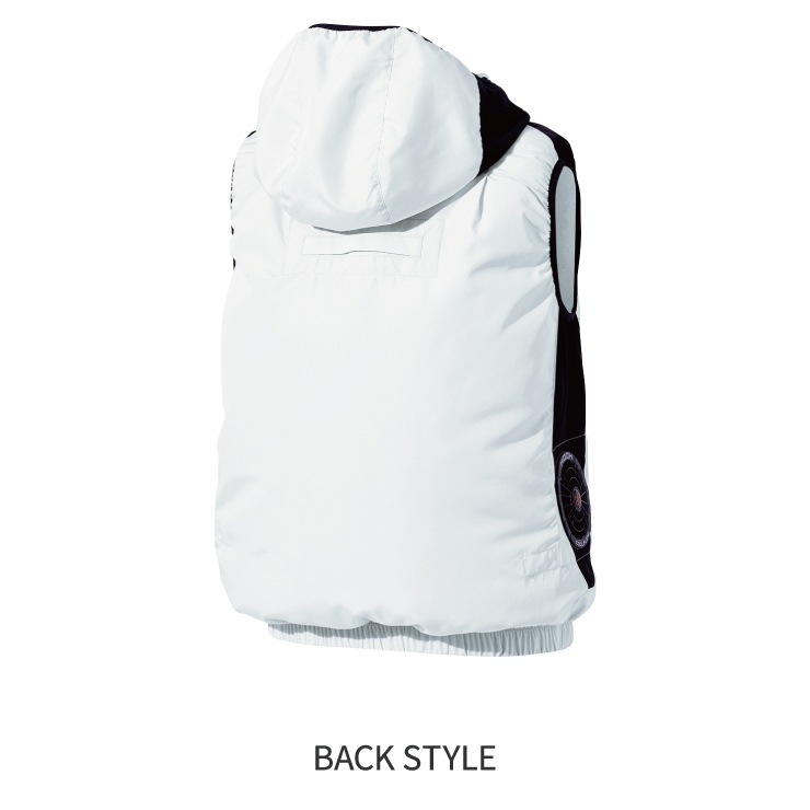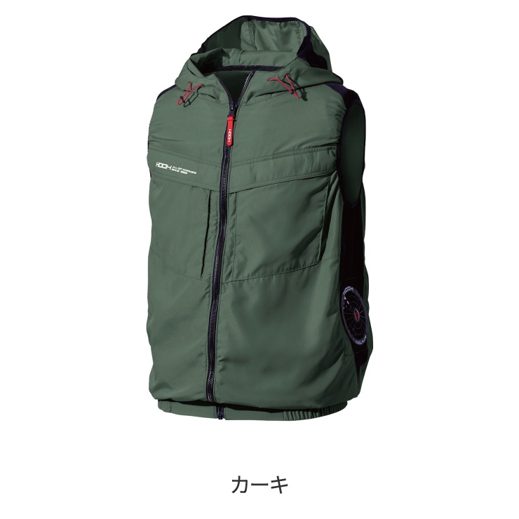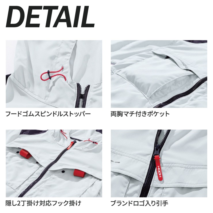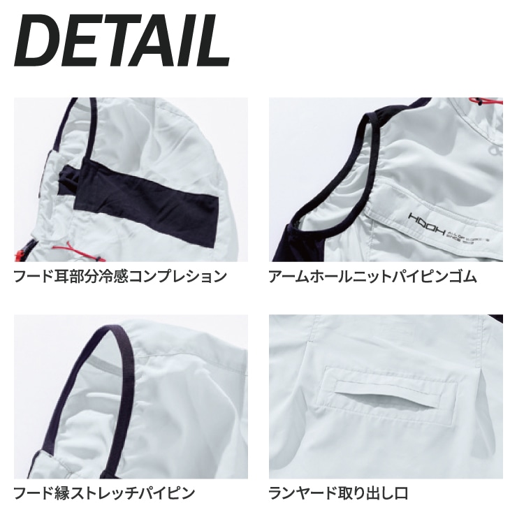 両胸マチ付きポケット / 両胸隠し2丁掛け対応フック掛け / 左袖ペン差しポケット / フードストレッチパイピン / フード耳部分冷感コンプレッション / フードゴムスピンドルストッパー / アームホールニットパイピン / サイドファン / 後身ランヤード取り出し口 / ファスナー付きバッテリーポケット / ケーブル止めマジックテープ / 首周り風抜け仕様