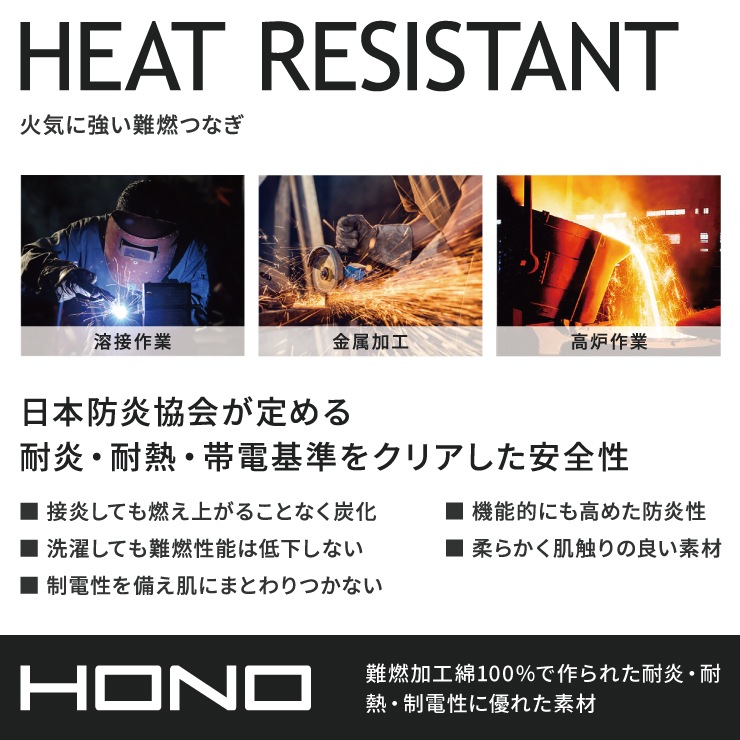 接炎しても燃え上がらず炭化する難燃加工綿を採用。洗濯しても難燃性能が低下せず、長期間にわたり着用可能。制電性を備えホコリや花粉を寄せ付けない。フルハーネス対応の空調服で熱中症対策。
