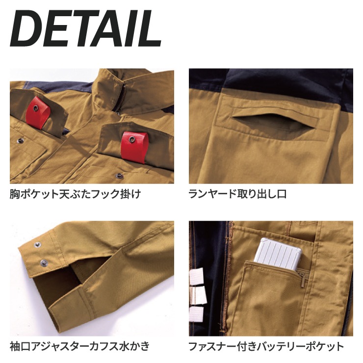 両胸ポケット / 胸ポケット天ぶたフック掛け / 右胸ファスナーポケット / 左袖ペン差しポケット / アジャスターカフス(袖空き部水かき)/ ファスナー付きバッテリーポケット / 後身ランヤード取り出し口