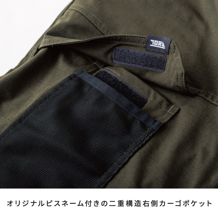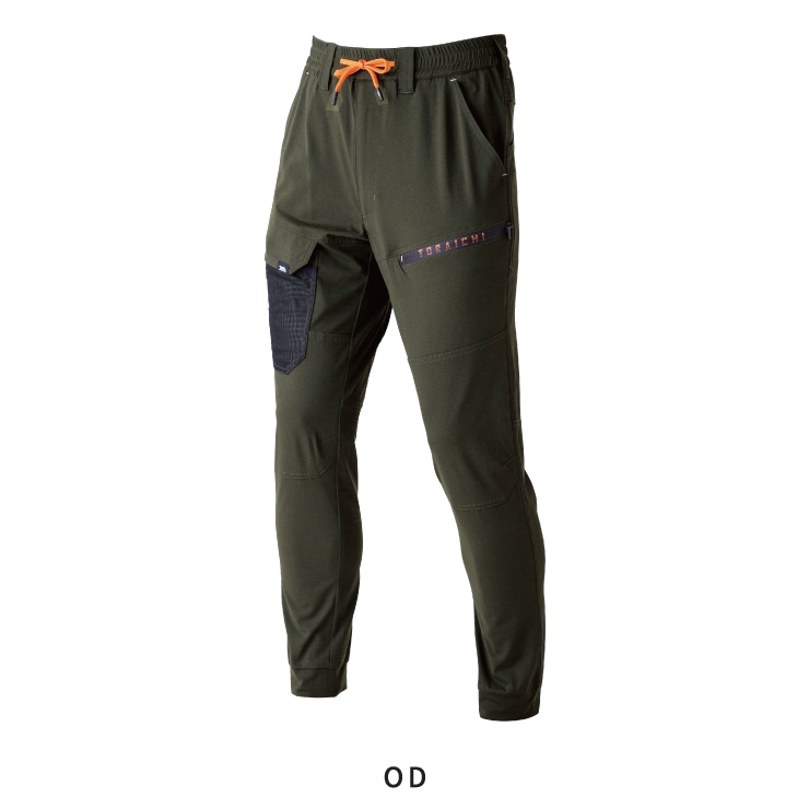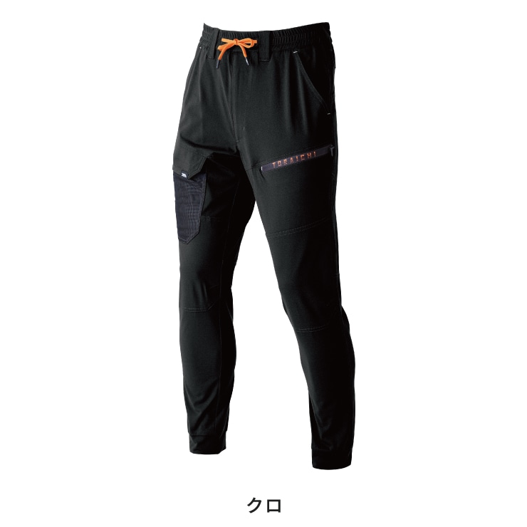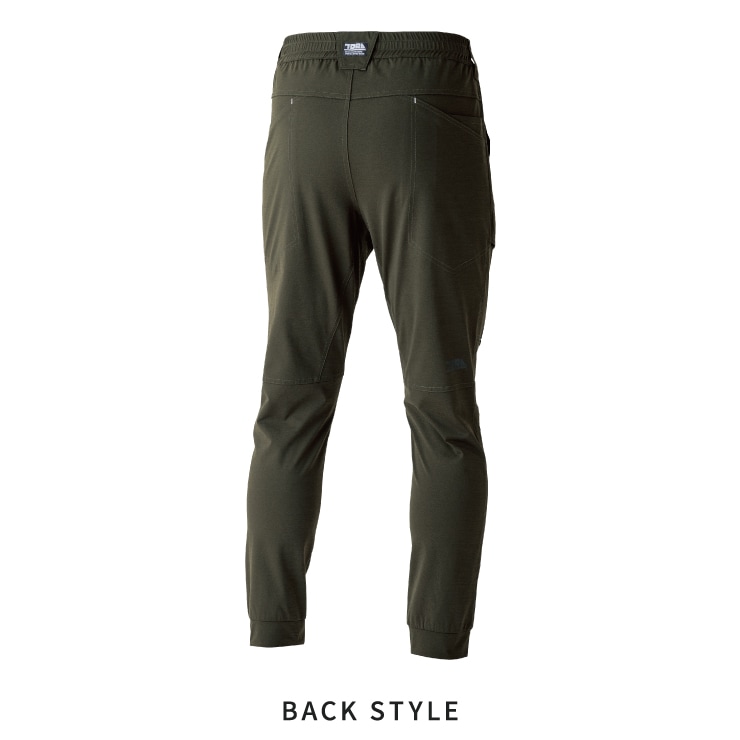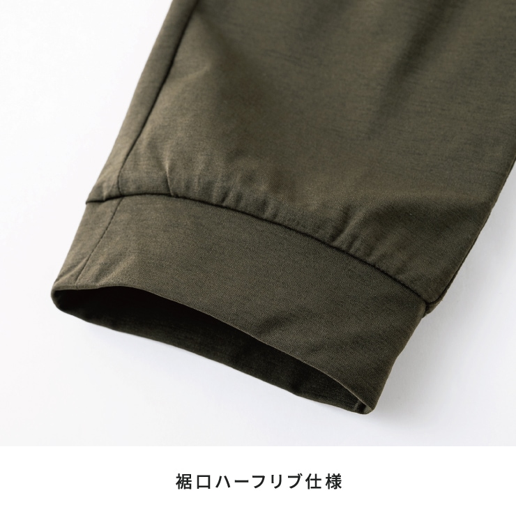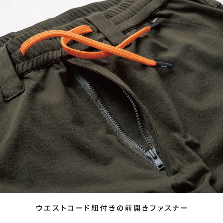 両側ポケット / 後身両側ポケット(右側ダブルポケット)/ 右側二重カーゴポケット / 左側ファスナーポケット / 裾ハーフリブ仕様 / ウエストゴム