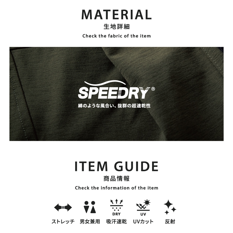 身体の動きに対する追従性に優れた機能糸SPEEDRY®天竺ニット素材を採用。独自の紡績技術で綿のような風合いと、一般基準より2倍の速乾性スピードで快適な着心地を実現。ウエストの紐は通し穴で裏側へ出せる仕様。カジュアルで軽快に着こなせるデザイン。